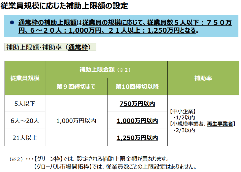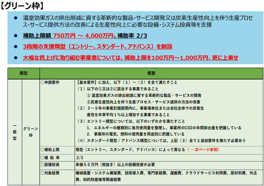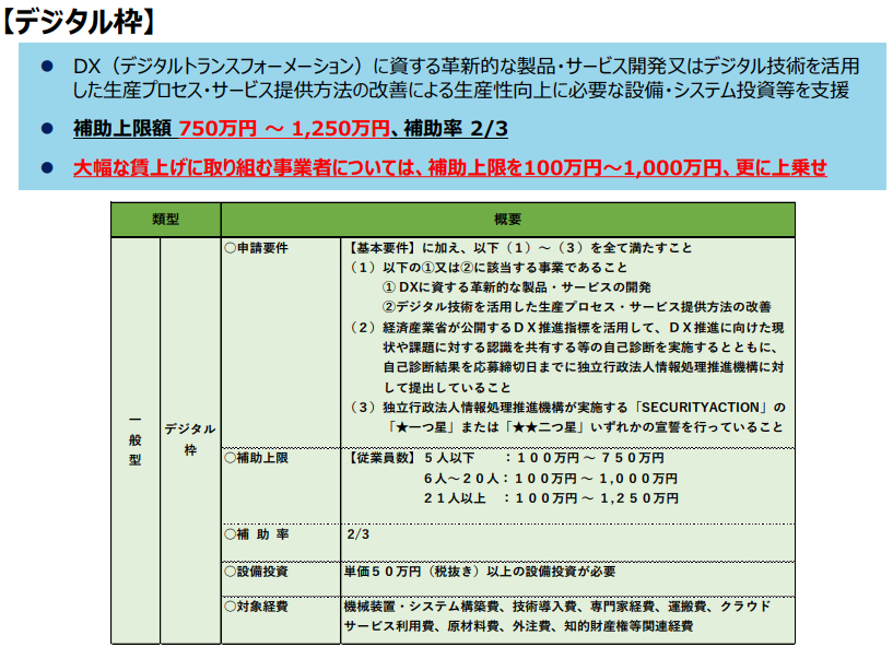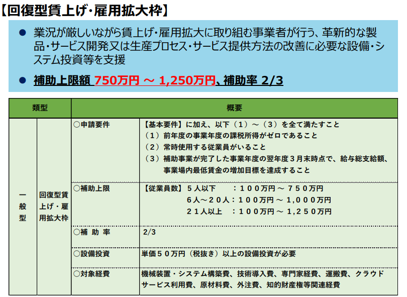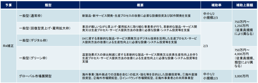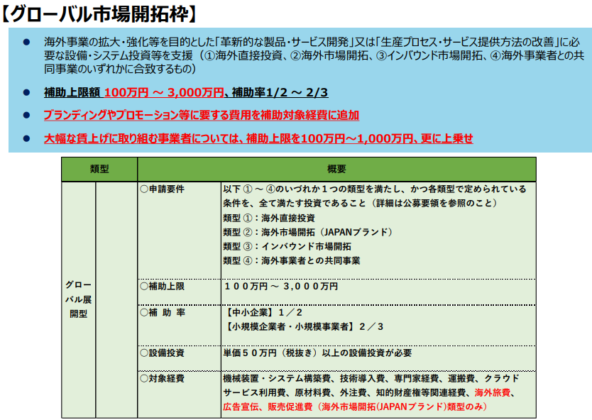 補助対象経費:①機械装置・システム構築費、➁運搬費、③技術導入費、④知財権関連経費、⑤外注費、⑥専門家経費、⑦クラウドサービス利用費、⑧原材料経費(以上に加えて、グローバル展開型では、海外旅費も対象)