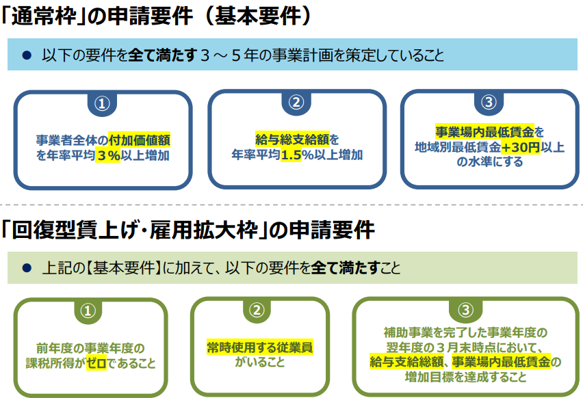 基本要件:①付加価値額 +3%以上/年 ➁給与支給総額 +1.5%以上/年 ③事業場内最低賃金≧地域別最低賃金 +30円  ①~③の条件を満たす3~5年の事業計画の策定・実行